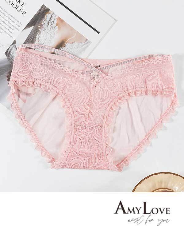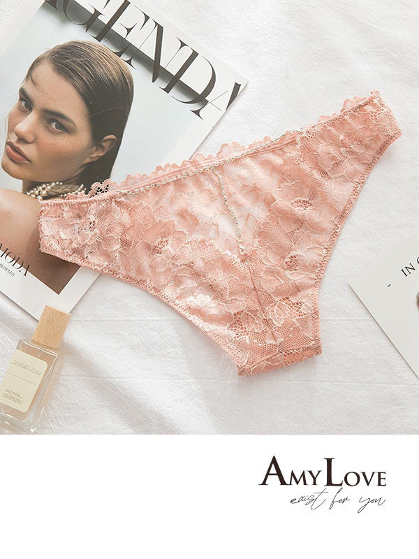 鑽飾V交叉性感鏤空蕾絲低腰三角褲 (粉色) M-L