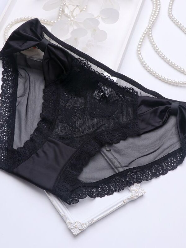 緞面雙蝴蝶結蕾絲花低腰性感網紗三角褲 (黑色) M-L