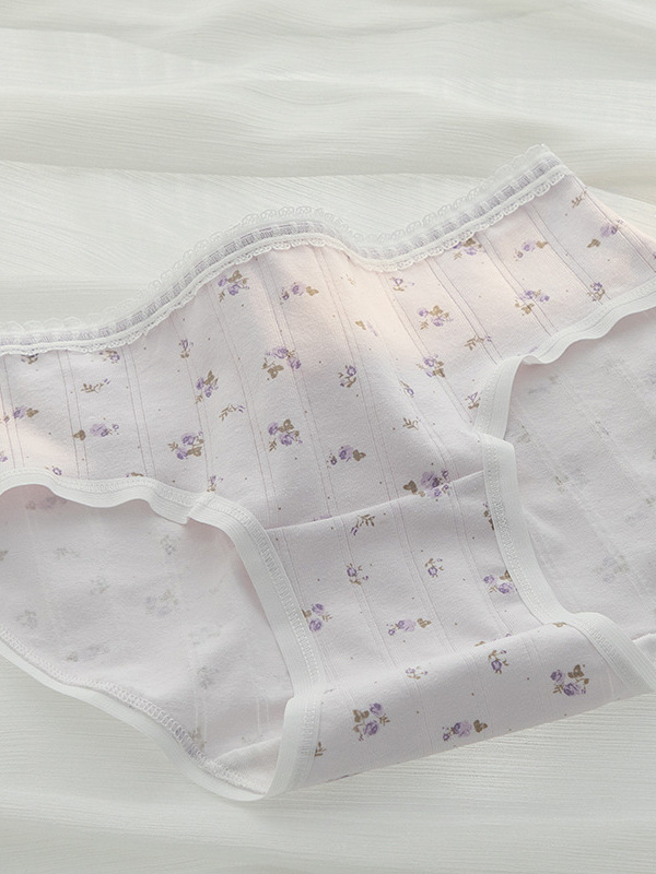 天真素棉質褲腳滾小條蕾絲包臀三角內褲 (淺紫色) M~XL