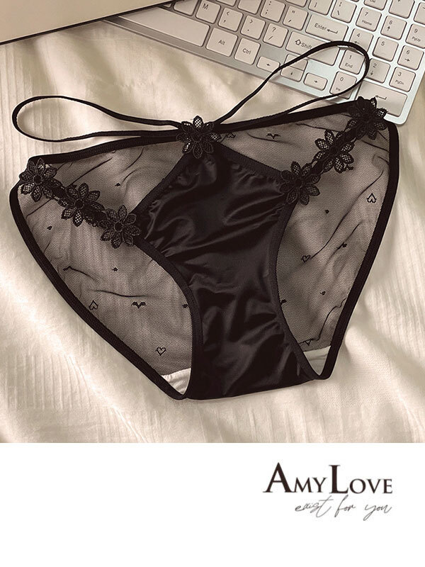 花朵網紗蕾絲透氣三角褲 (黑色)M-XL