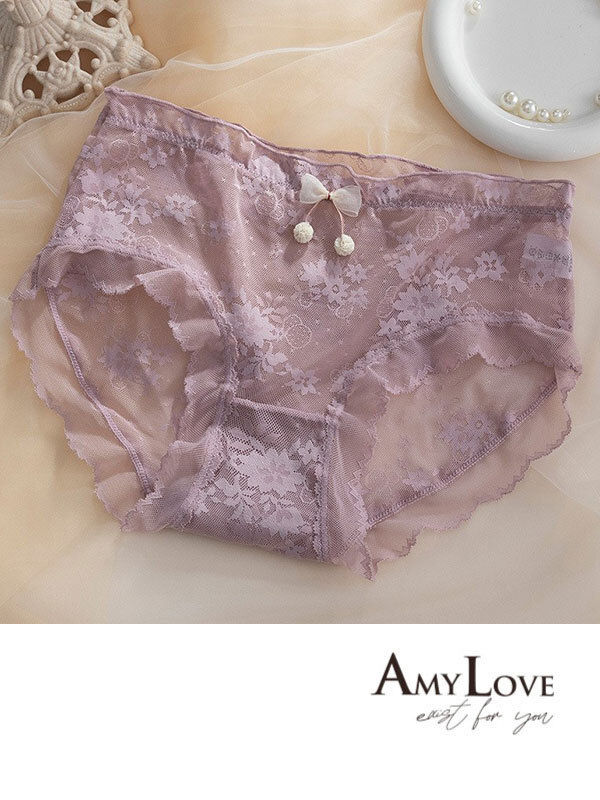 輕薄蕾絲網紗花前小毛球舒適透氣三角褲 (紫色) M-XL